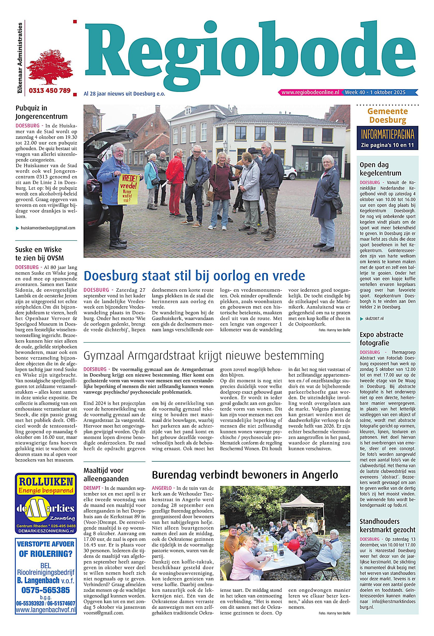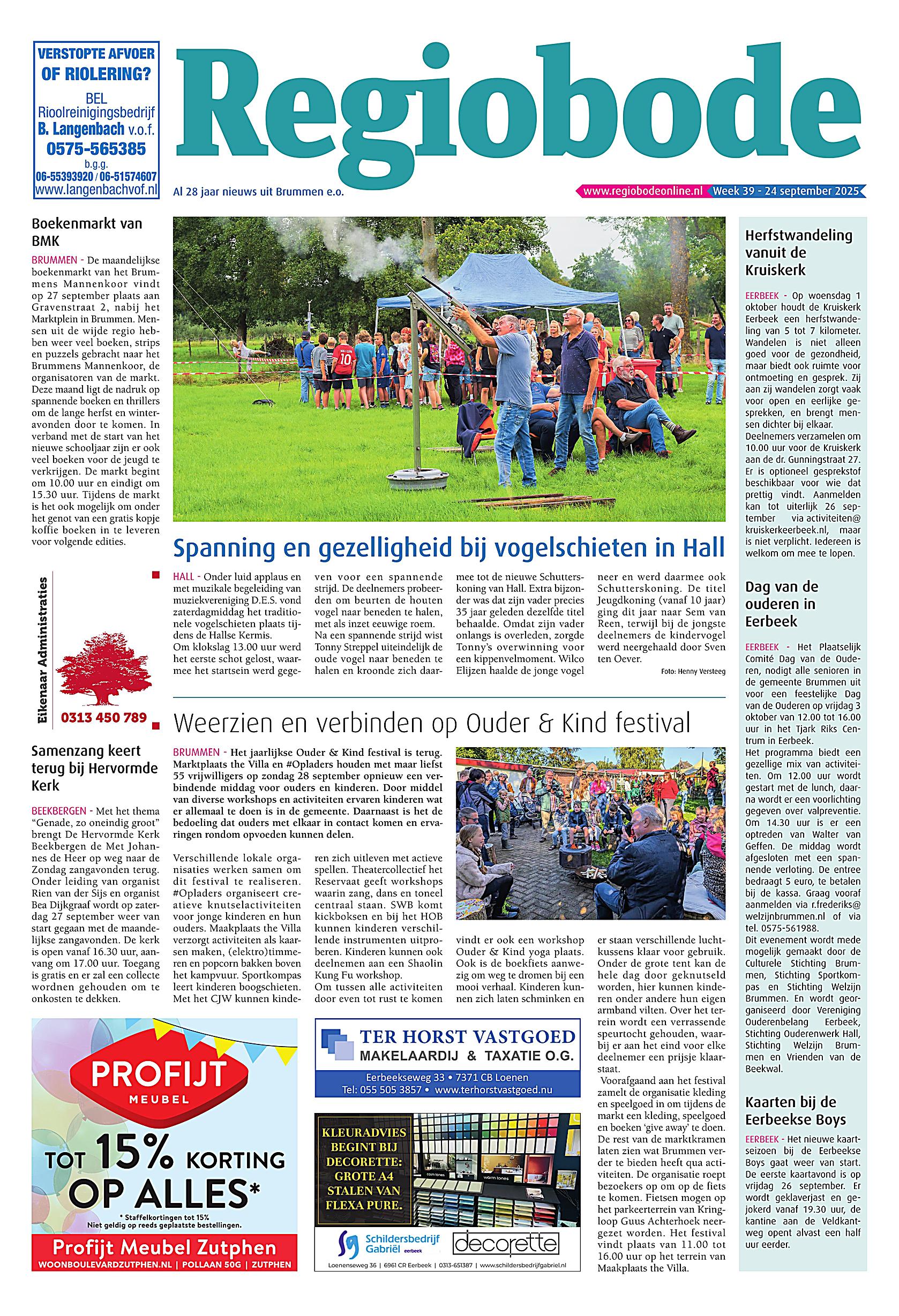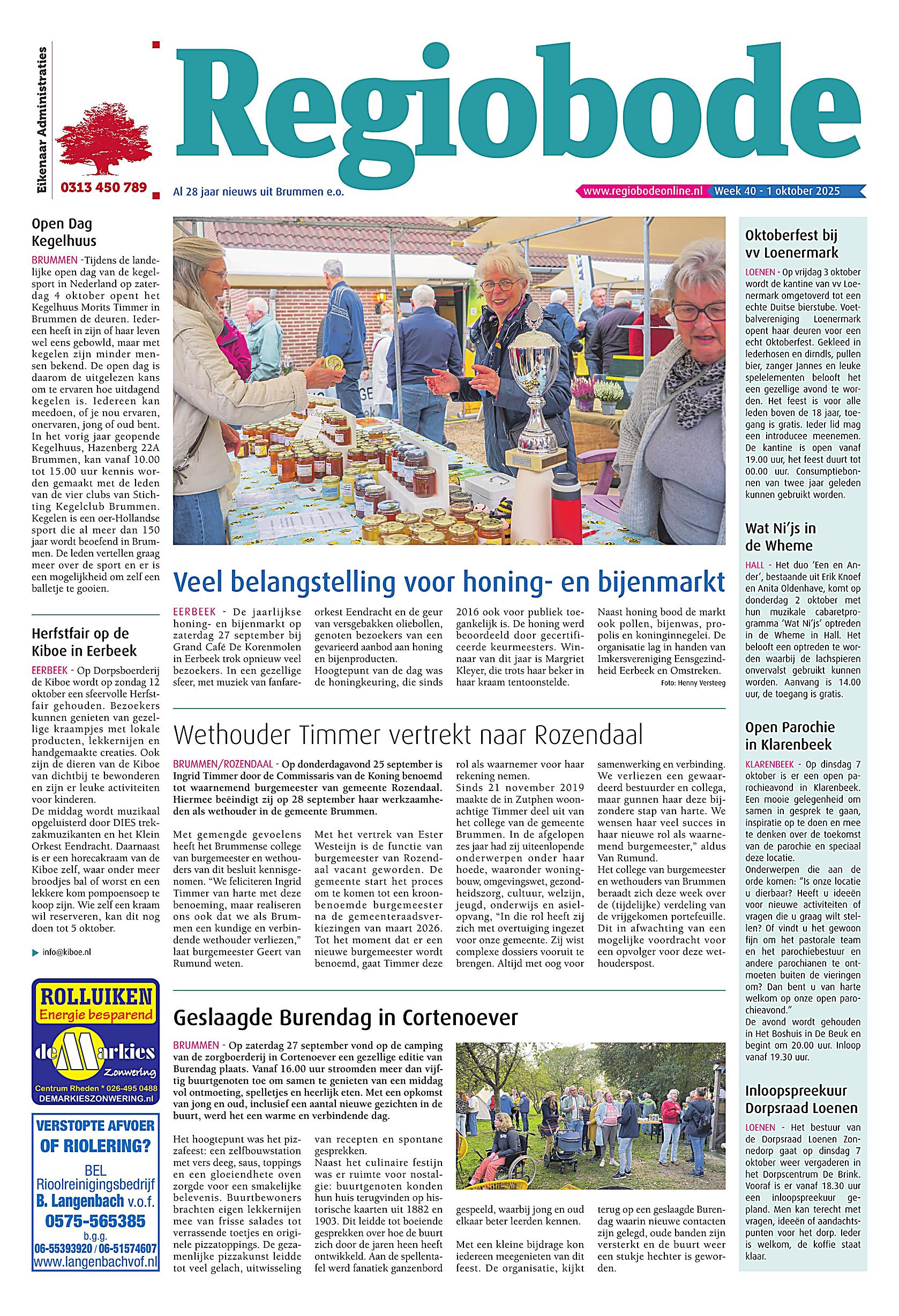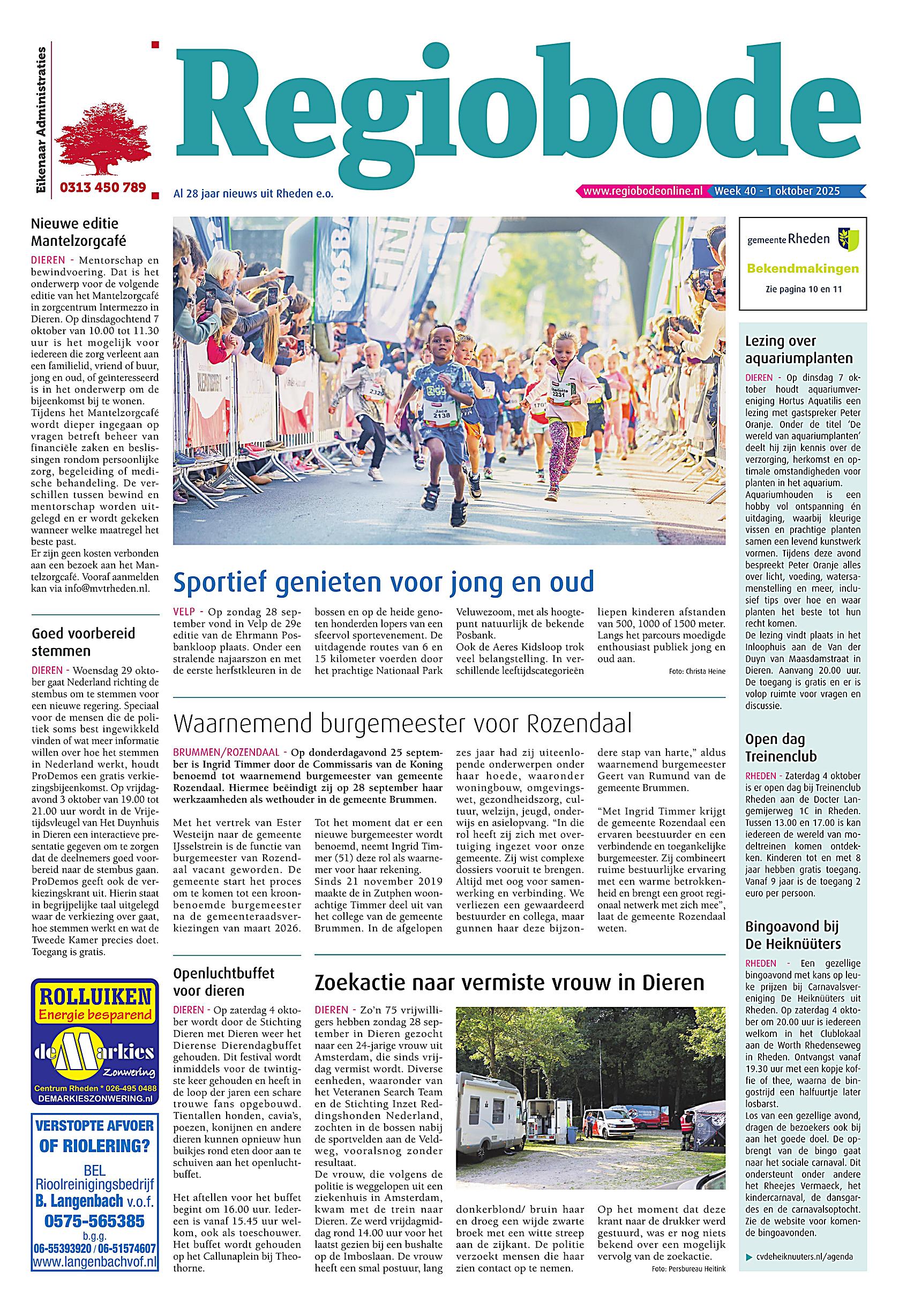 Welkom op het krantenarchief van Regiobode Beheer. Op deze plek zijn onze laatste uitgaven digitaal te lezen. Niet alleen zijn de redactionele bijdragen hier te zien, maar omdat complete uitgaven gedigitaliseerd worden, zijn ook alle advertenties te zien zoals ze in de gedrukte media zijn verschenen.