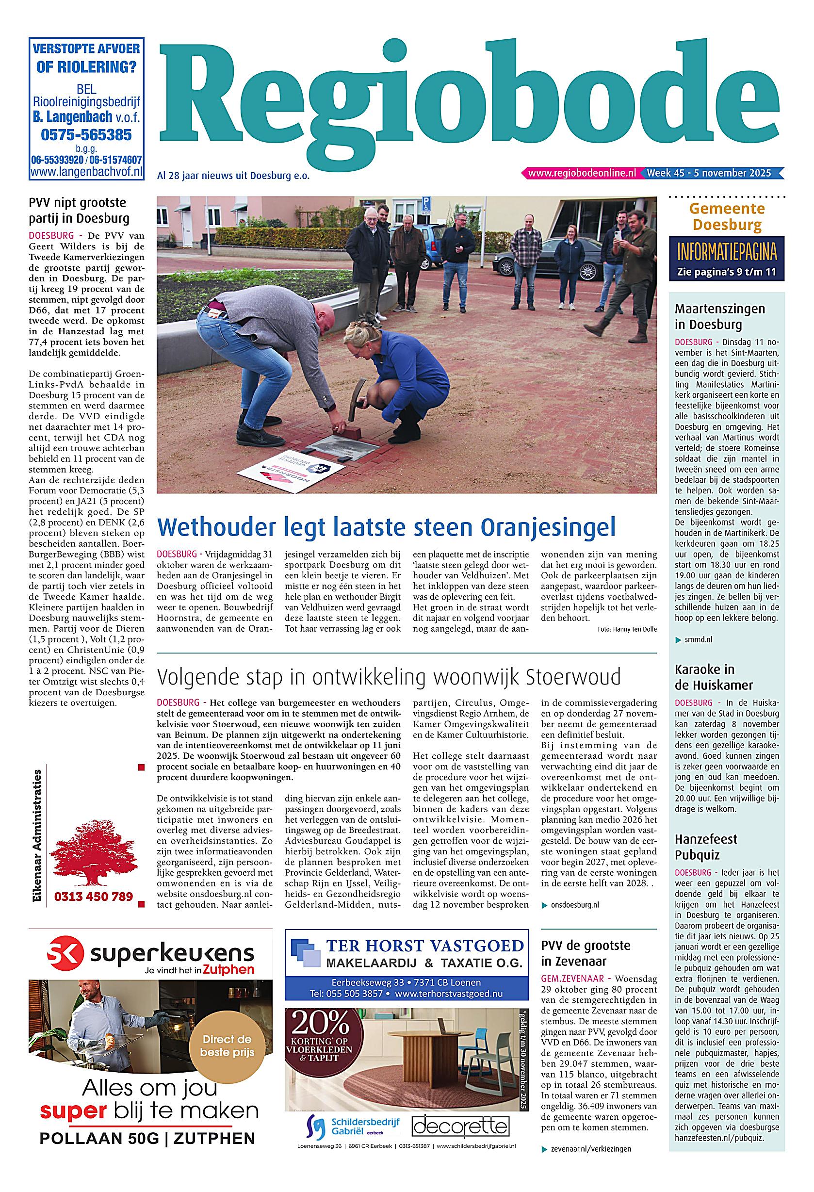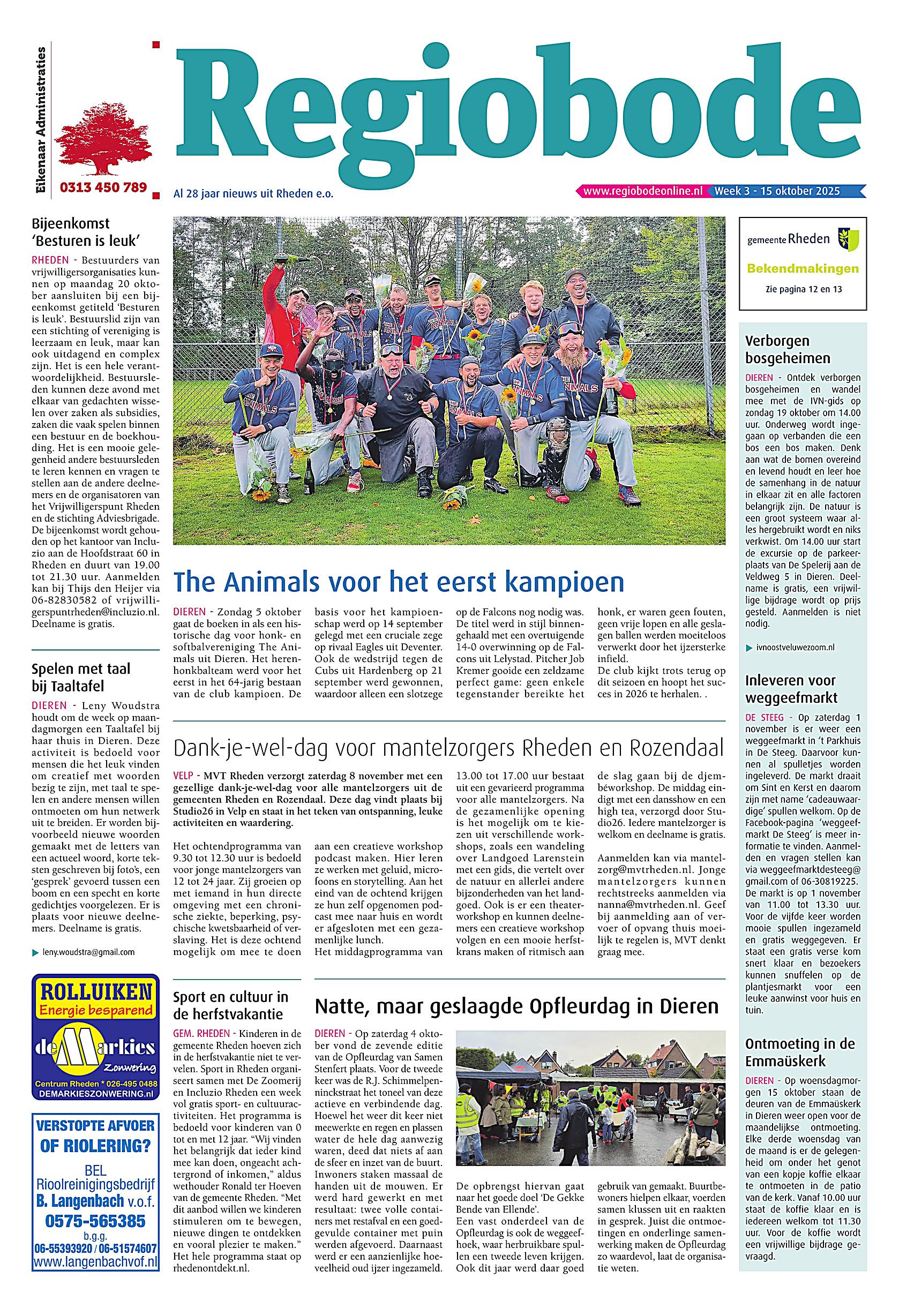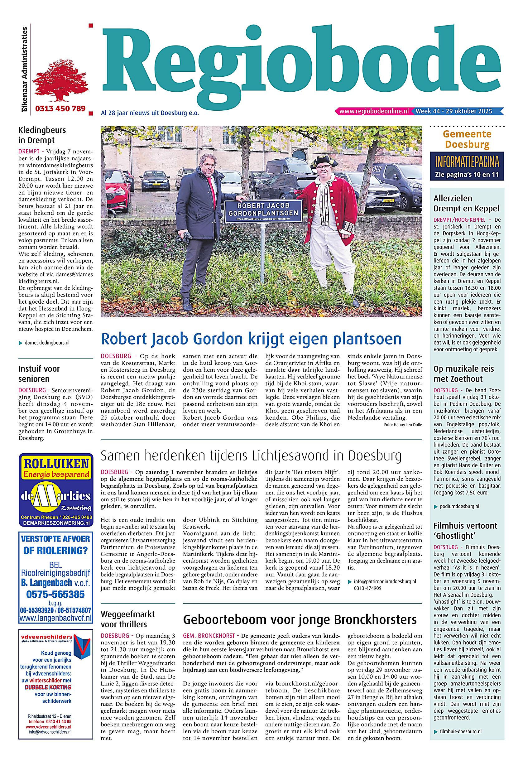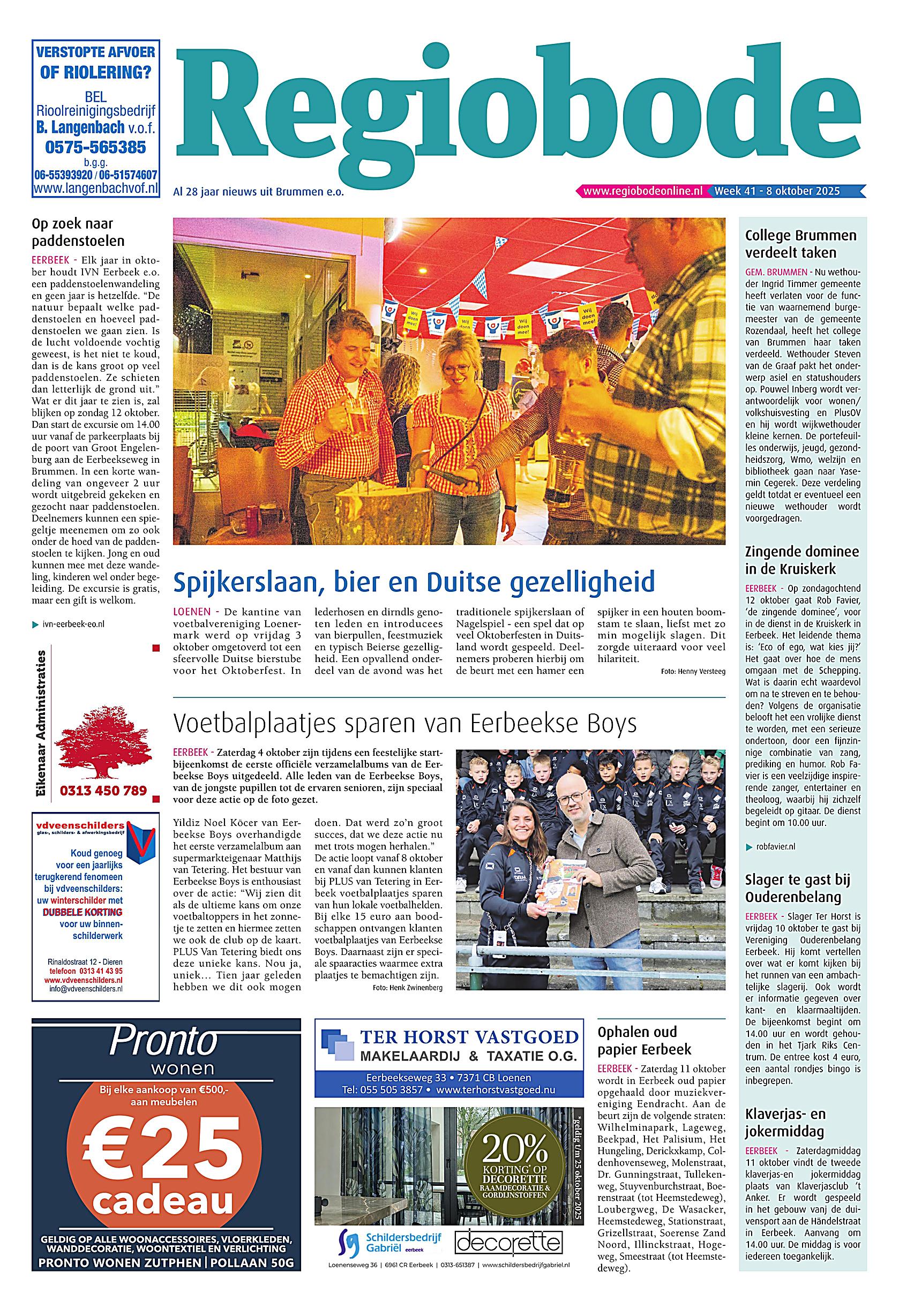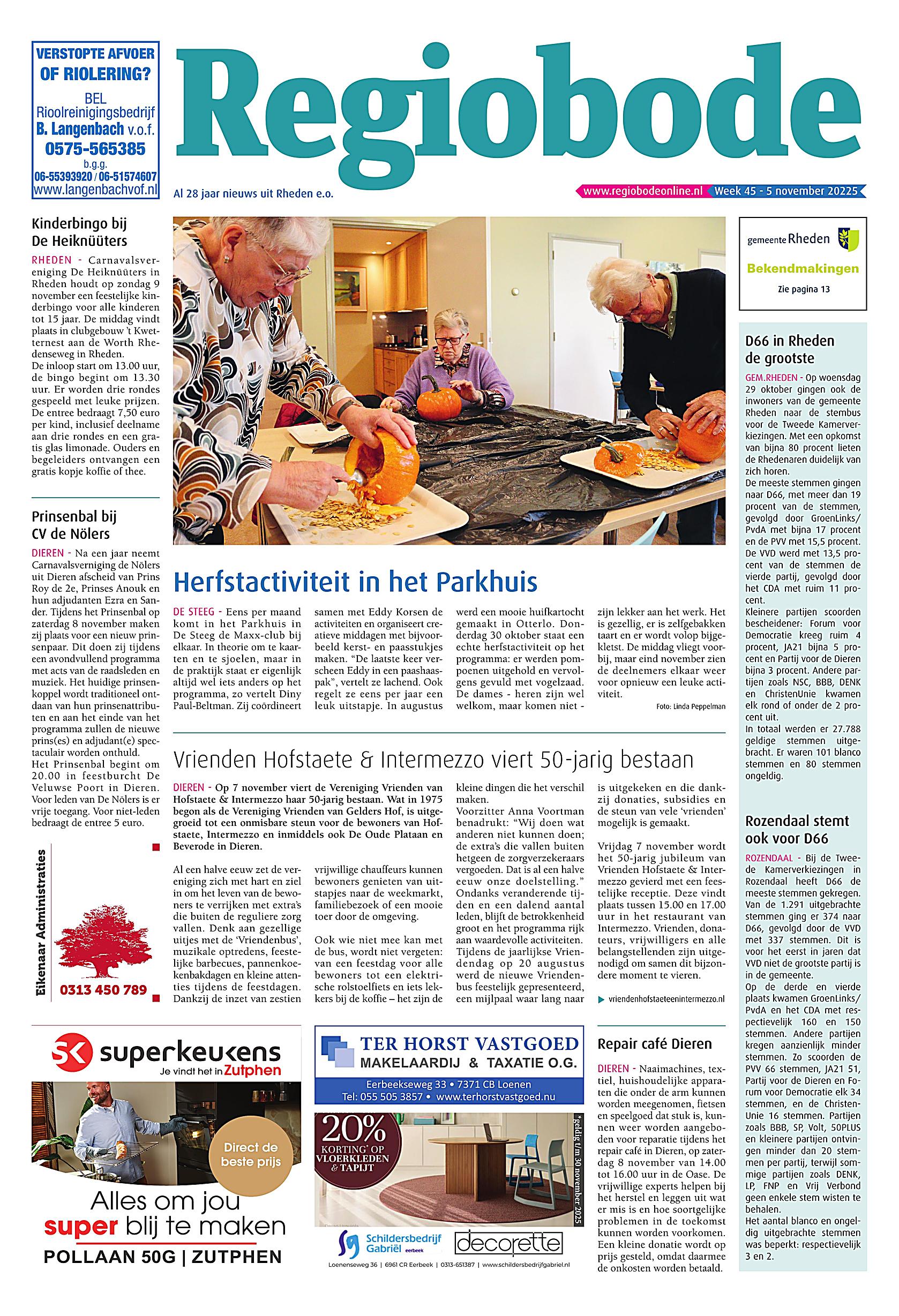 Welkom op het krantenarchief van Regiobode Beheer. Op deze plek zijn onze laatste uitgaven digitaal te lezen. Niet alleen zijn de redactionele bijdragen hier te zien, maar omdat complete uitgaven gedigitaliseerd worden, zijn ook alle advertenties te zien zoals ze in de gedrukte media zijn verschenen.