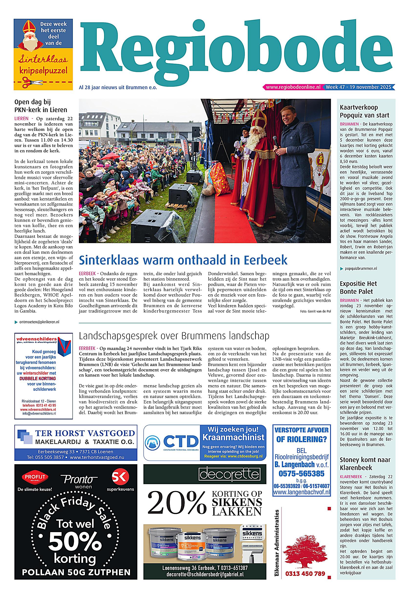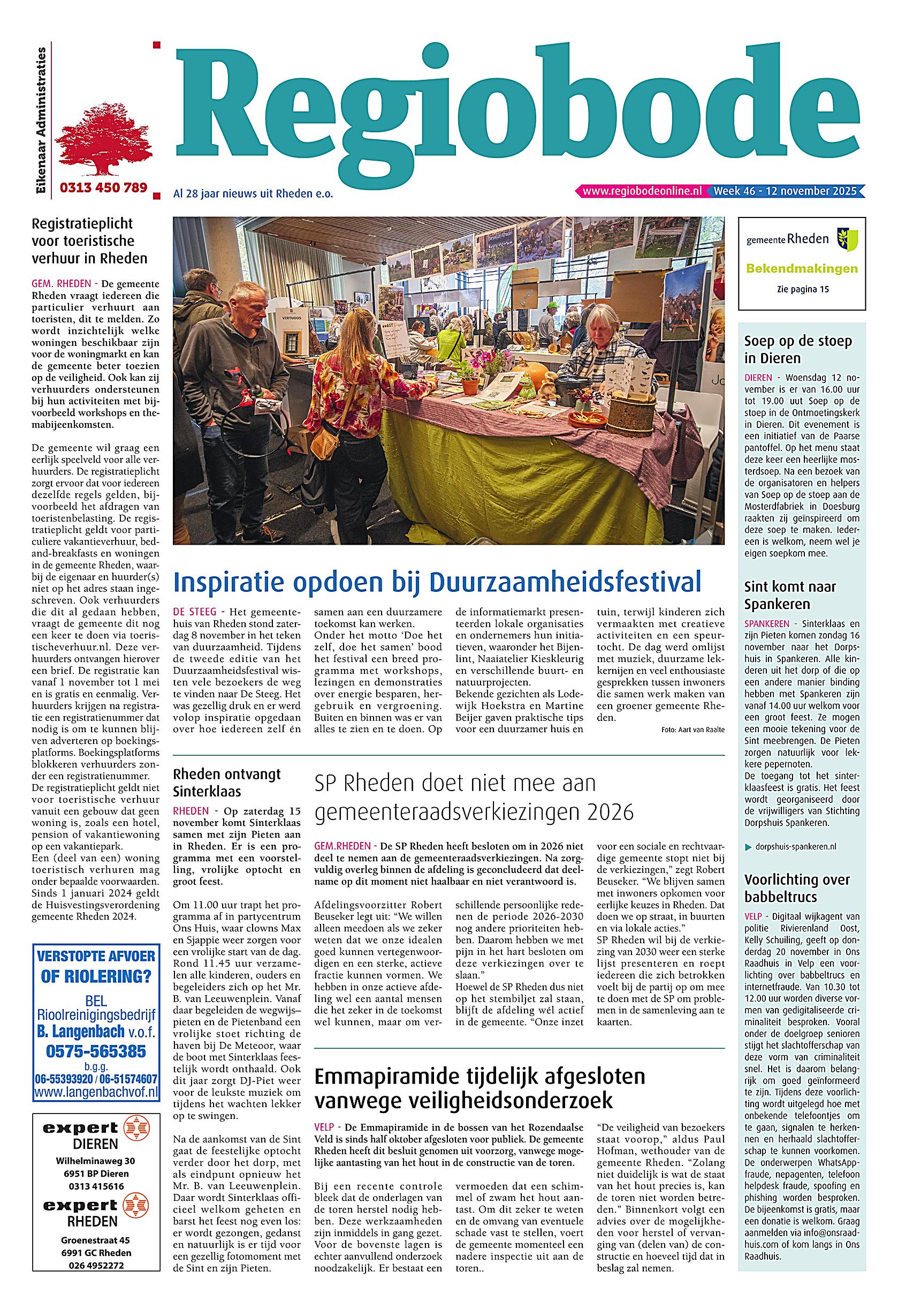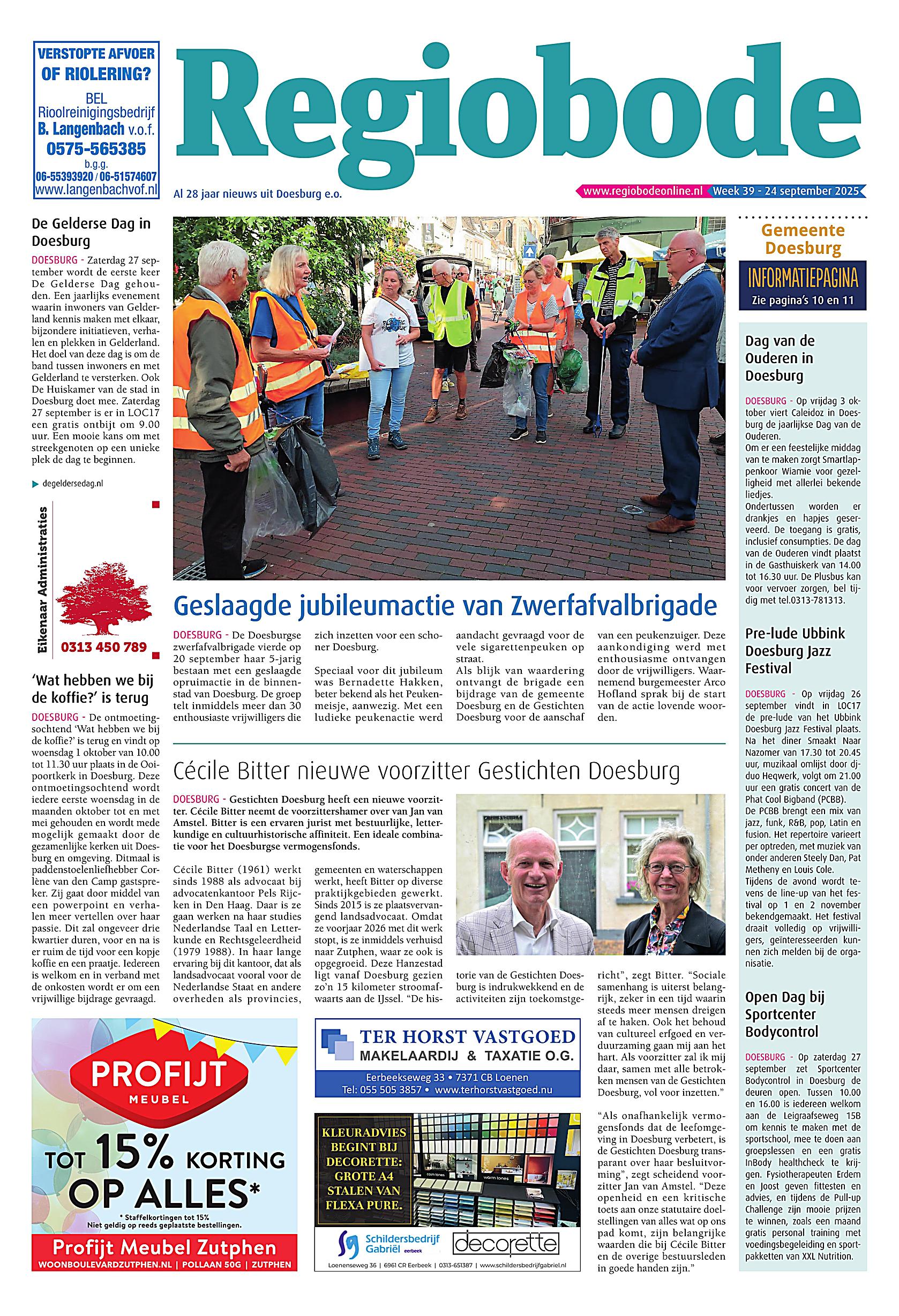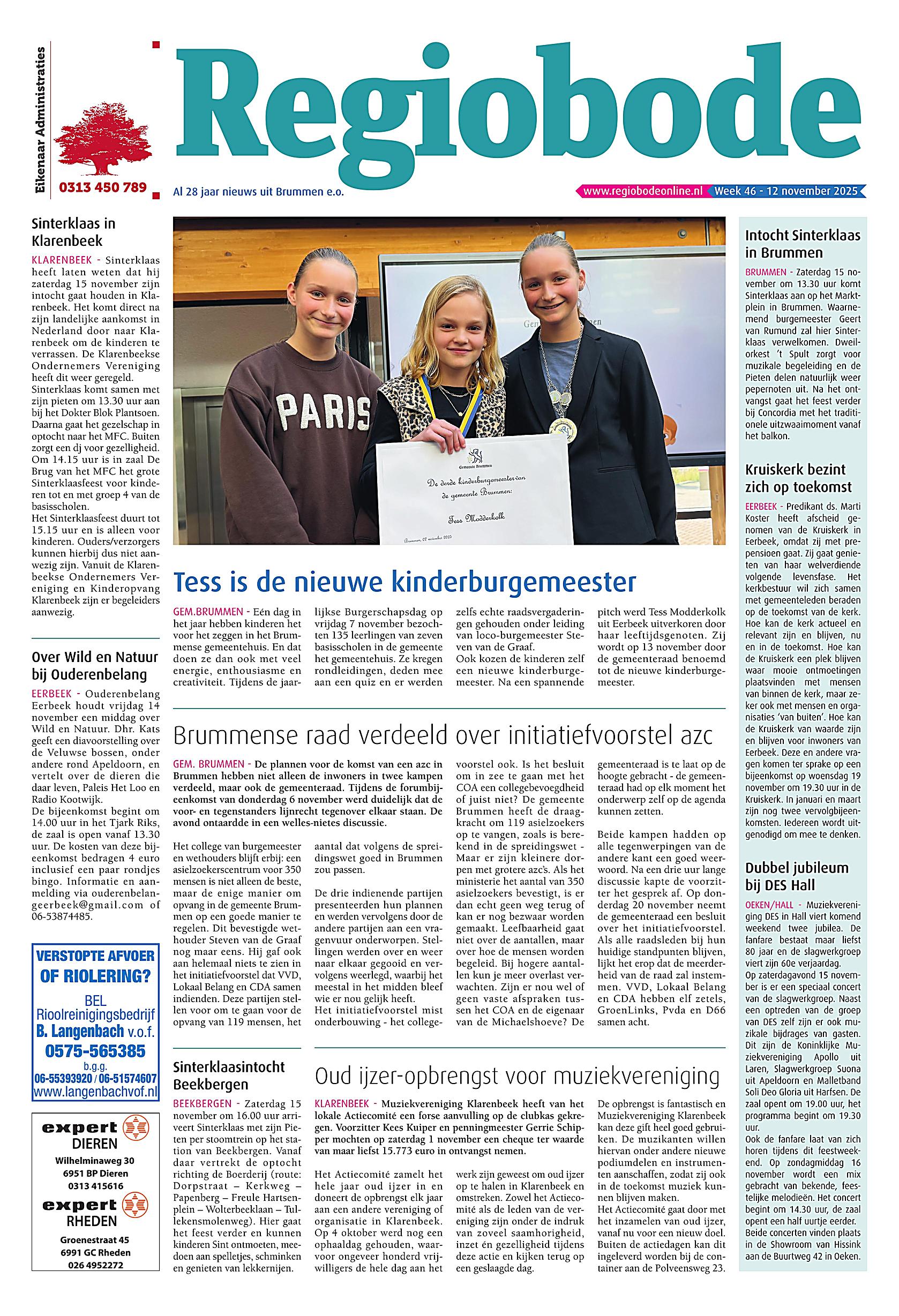 Welkom op het krantenarchief van Regiobode Beheer. Op deze plek zijn onze laatste uitgaven digitaal te lezen. Niet alleen zijn de redactionele bijdragen hier te zien, maar omdat complete uitgaven gedigitaliseerd worden, zijn ook alle advertenties te zien zoals ze in de gedrukte media zijn verschenen.