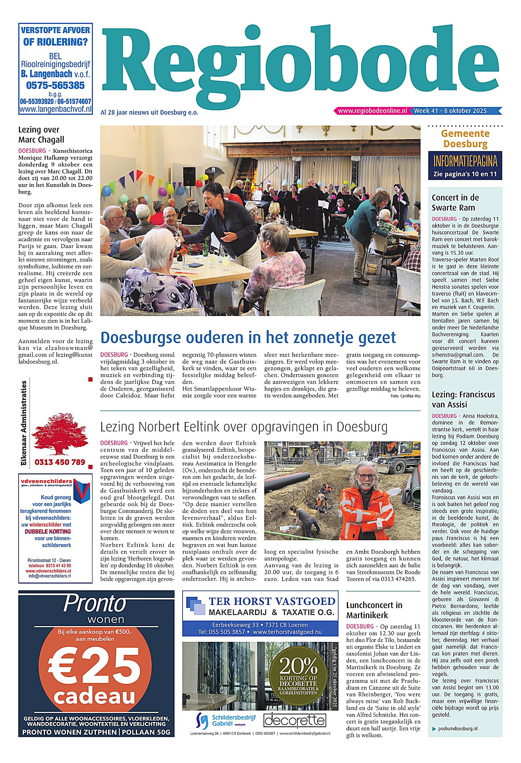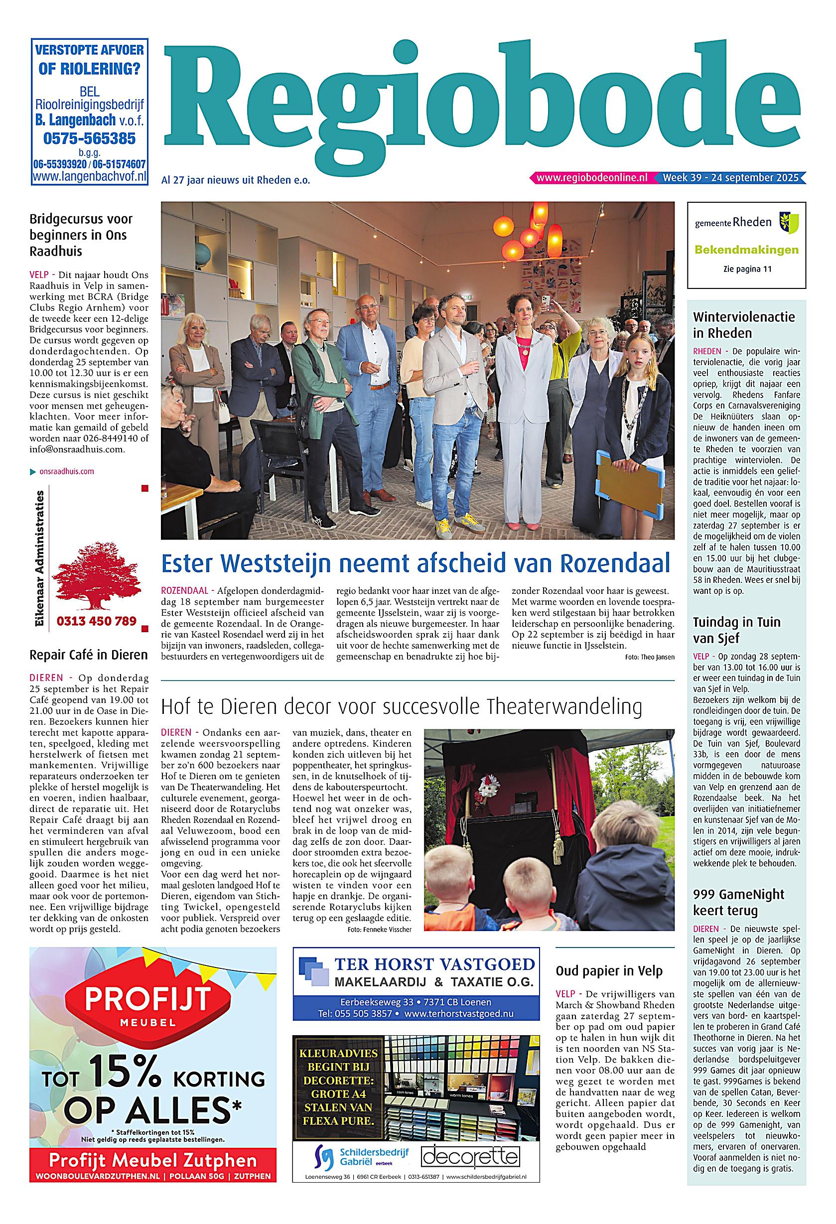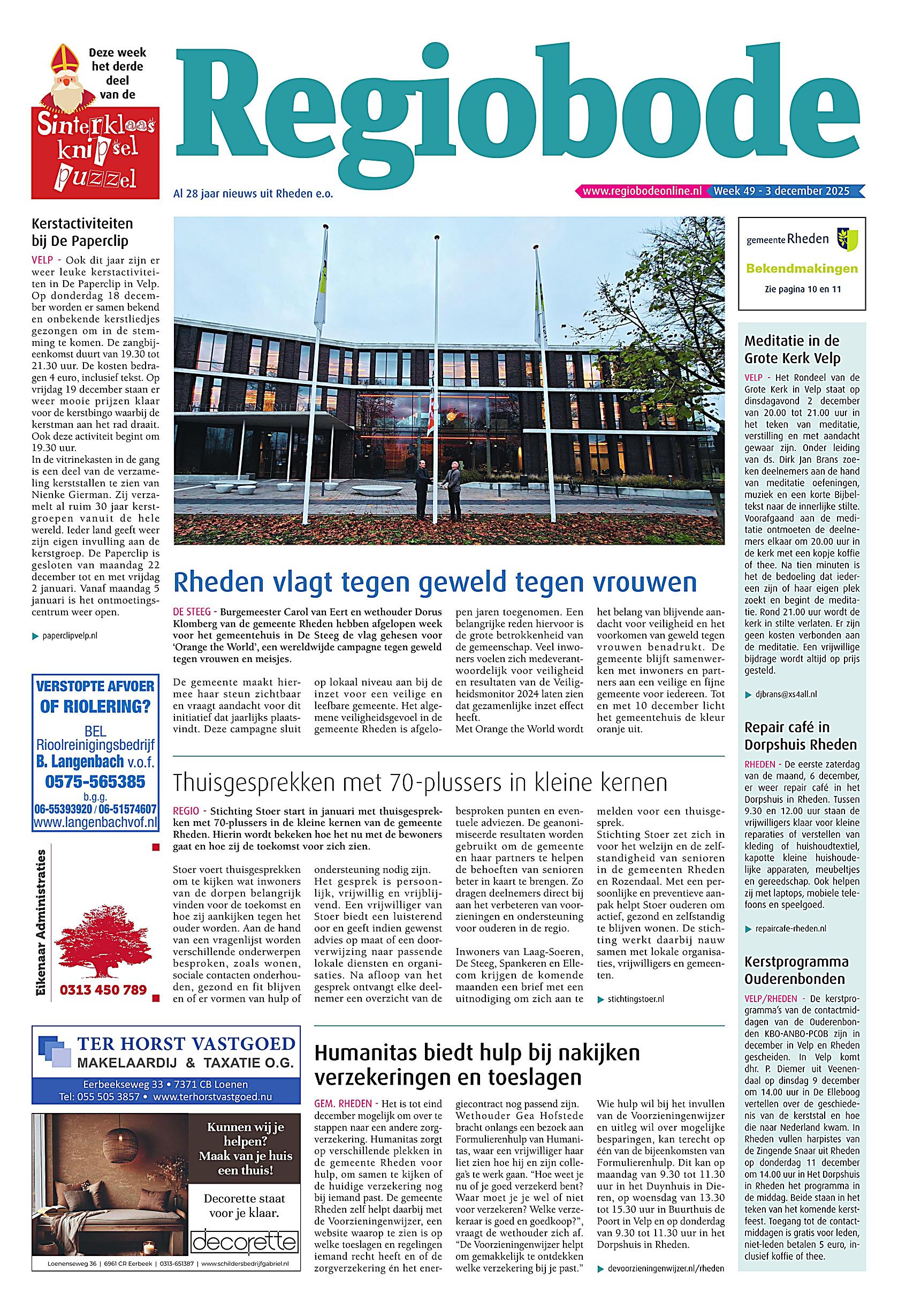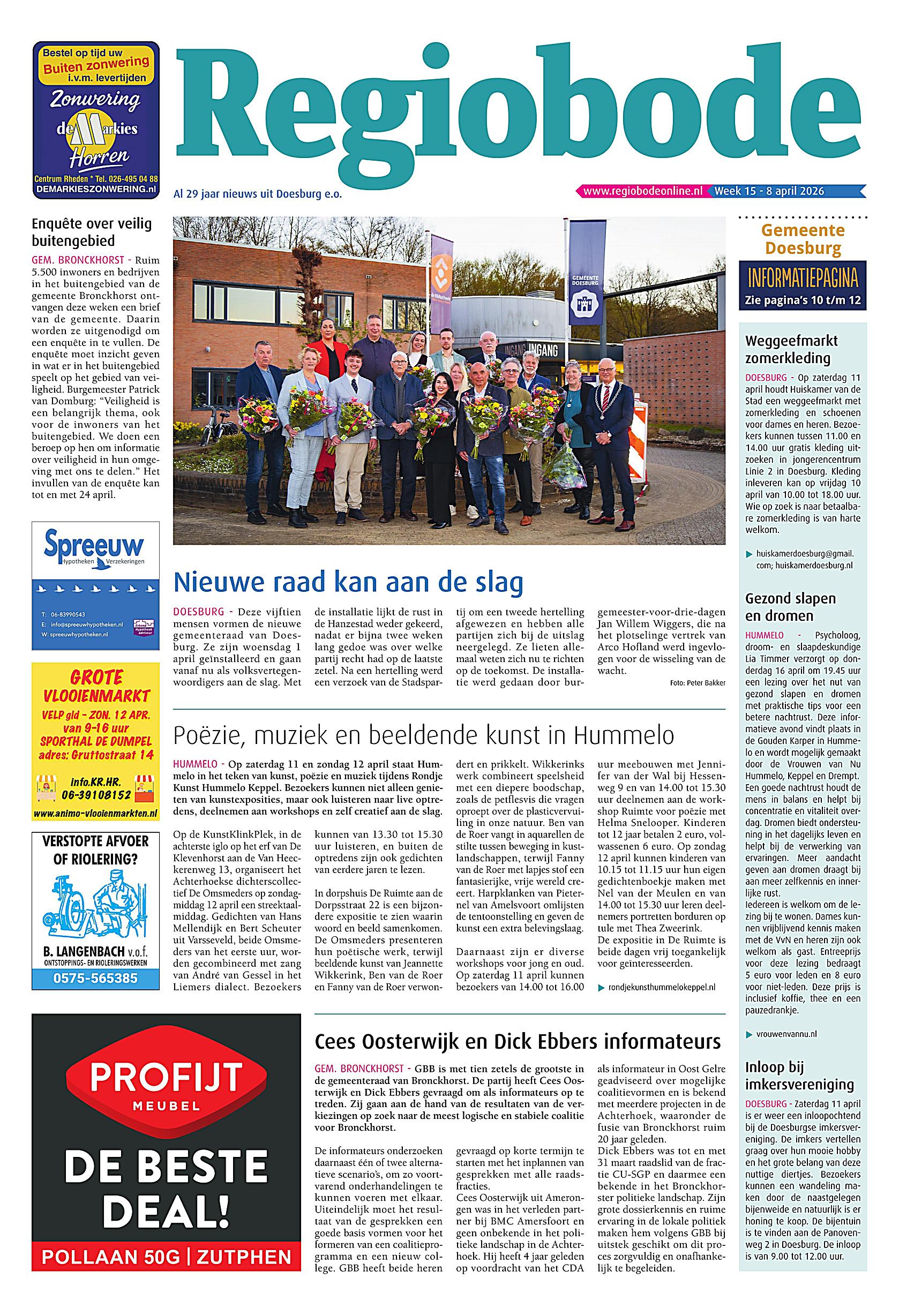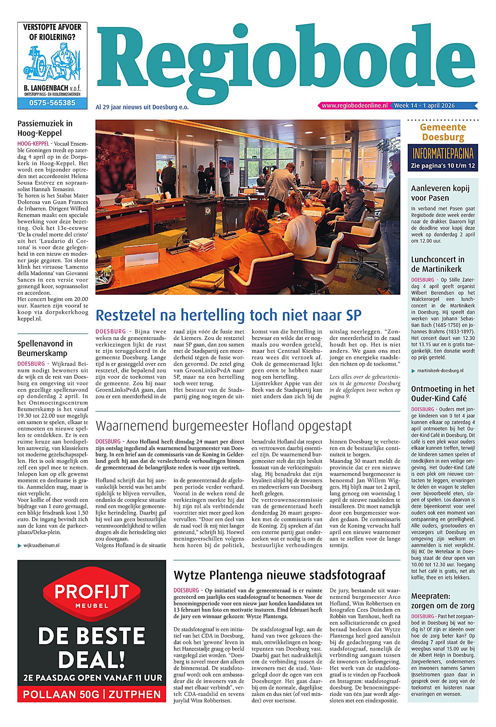 Welkom op het krantenarchief van Regiobode Beheer. Op deze plek zijn onze laatste uitgaven digitaal te lezen. Niet alleen zijn de redactionele bijdragen hier te zien, maar omdat complete uitgaven gedigitaliseerd worden, zijn ook alle advertenties te zien zoals ze in de gedrukte media zijn verschenen.