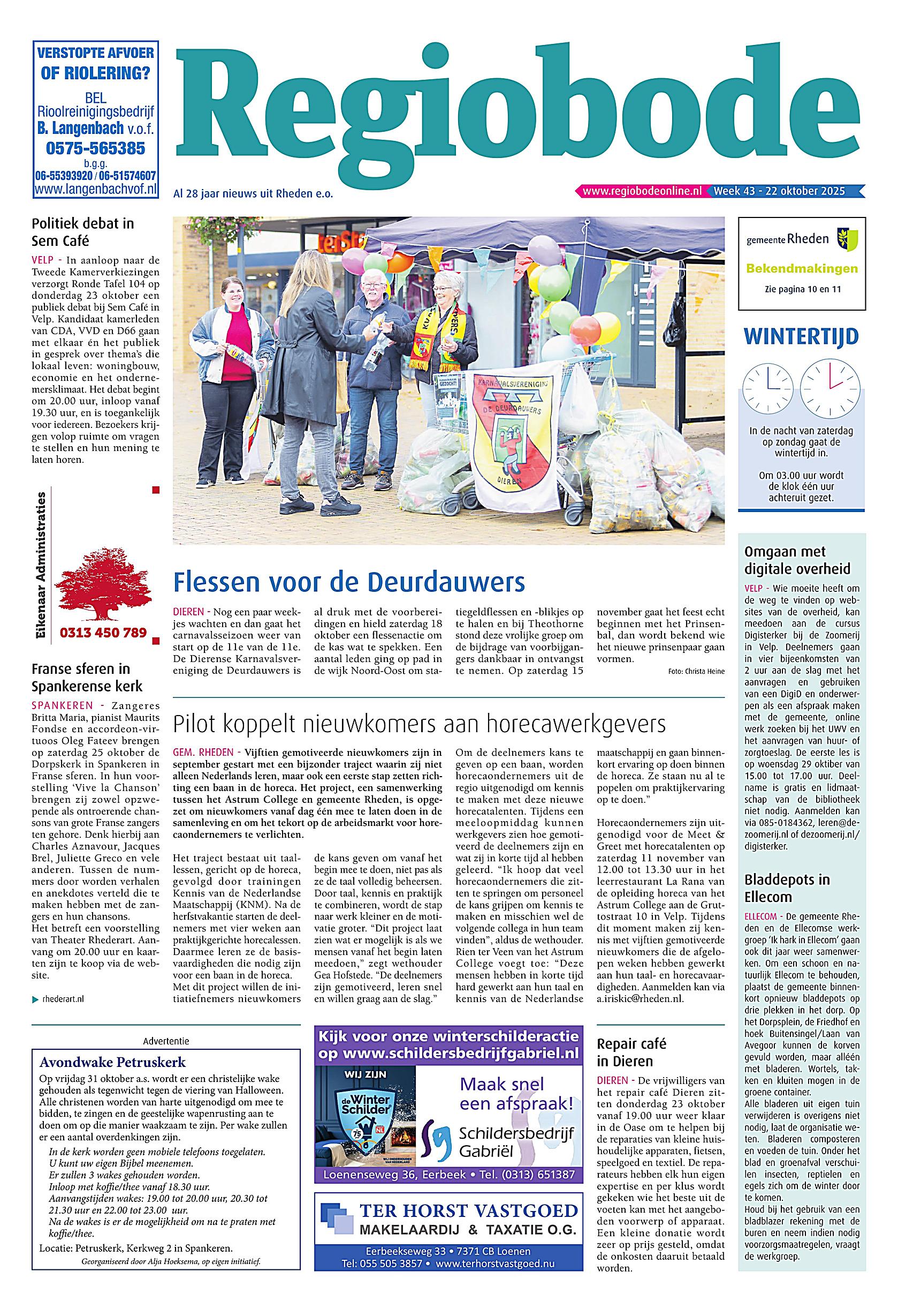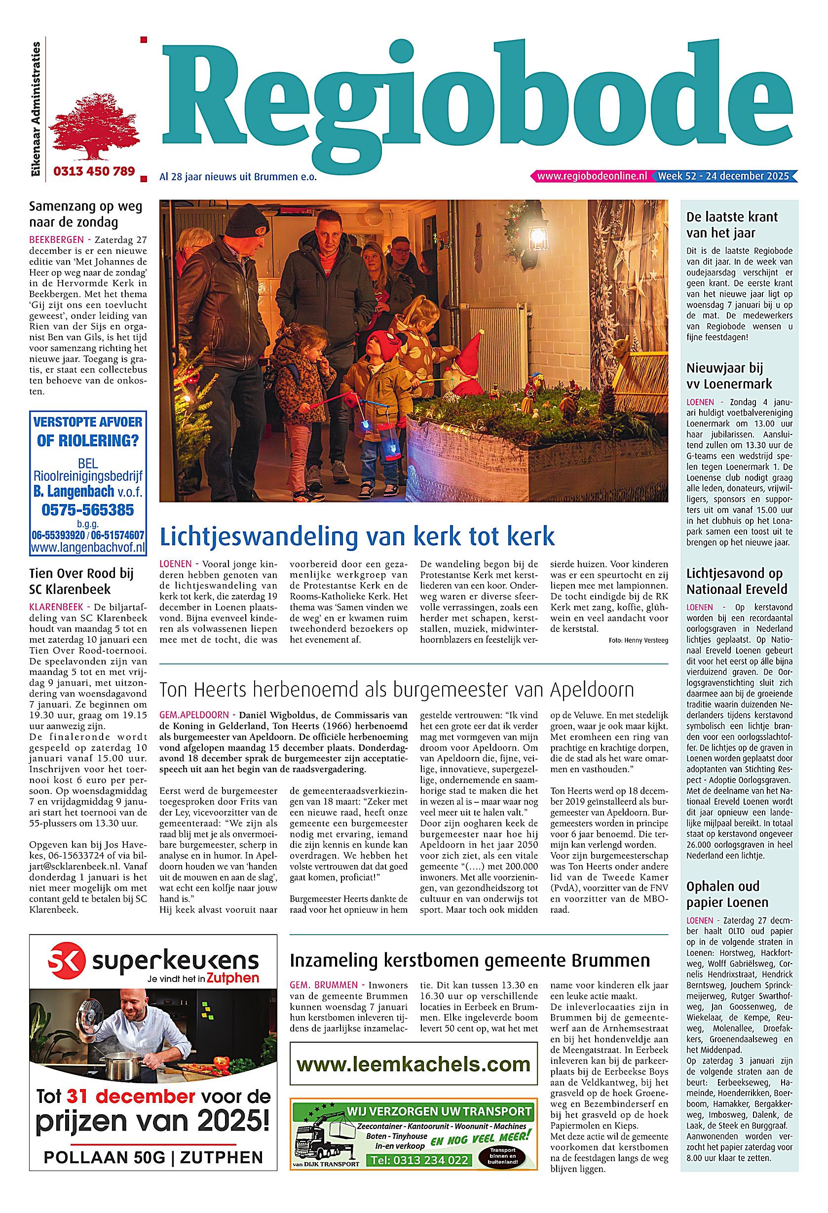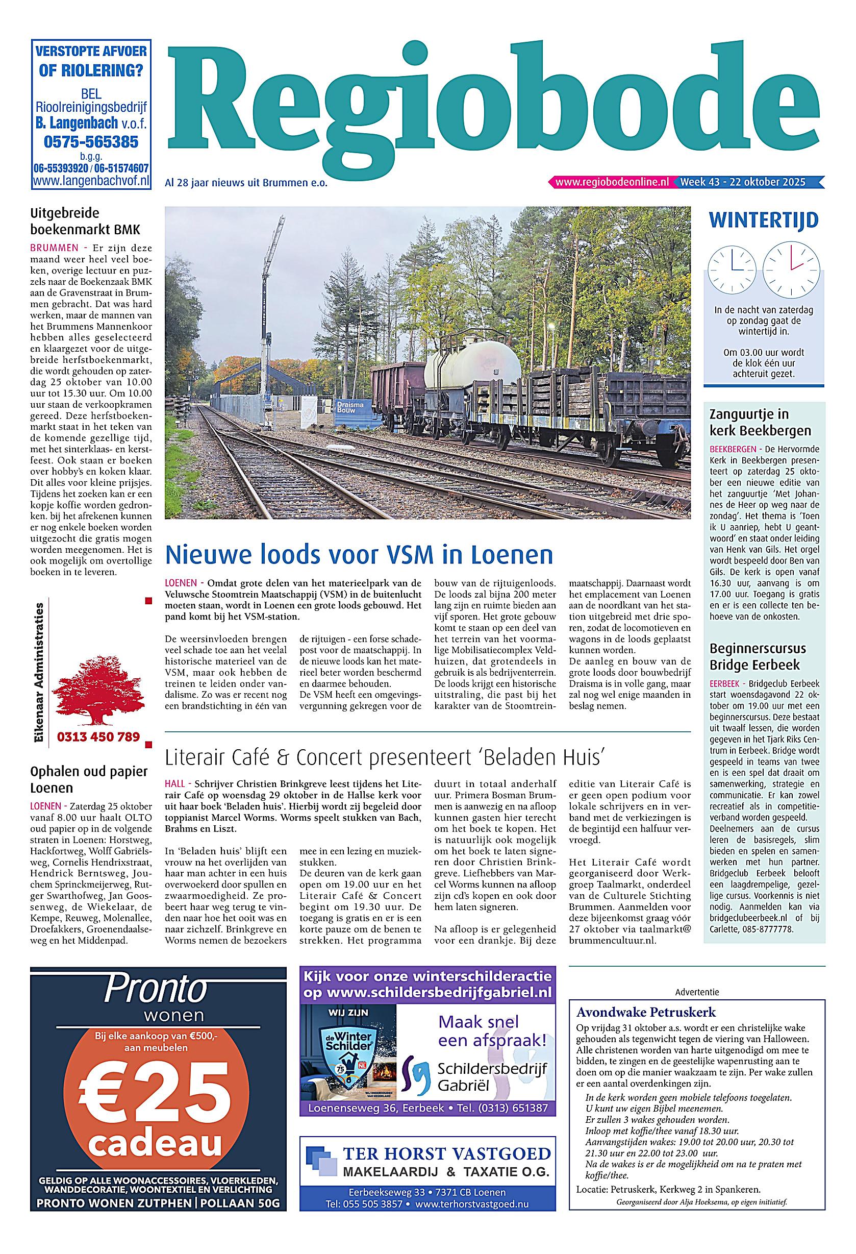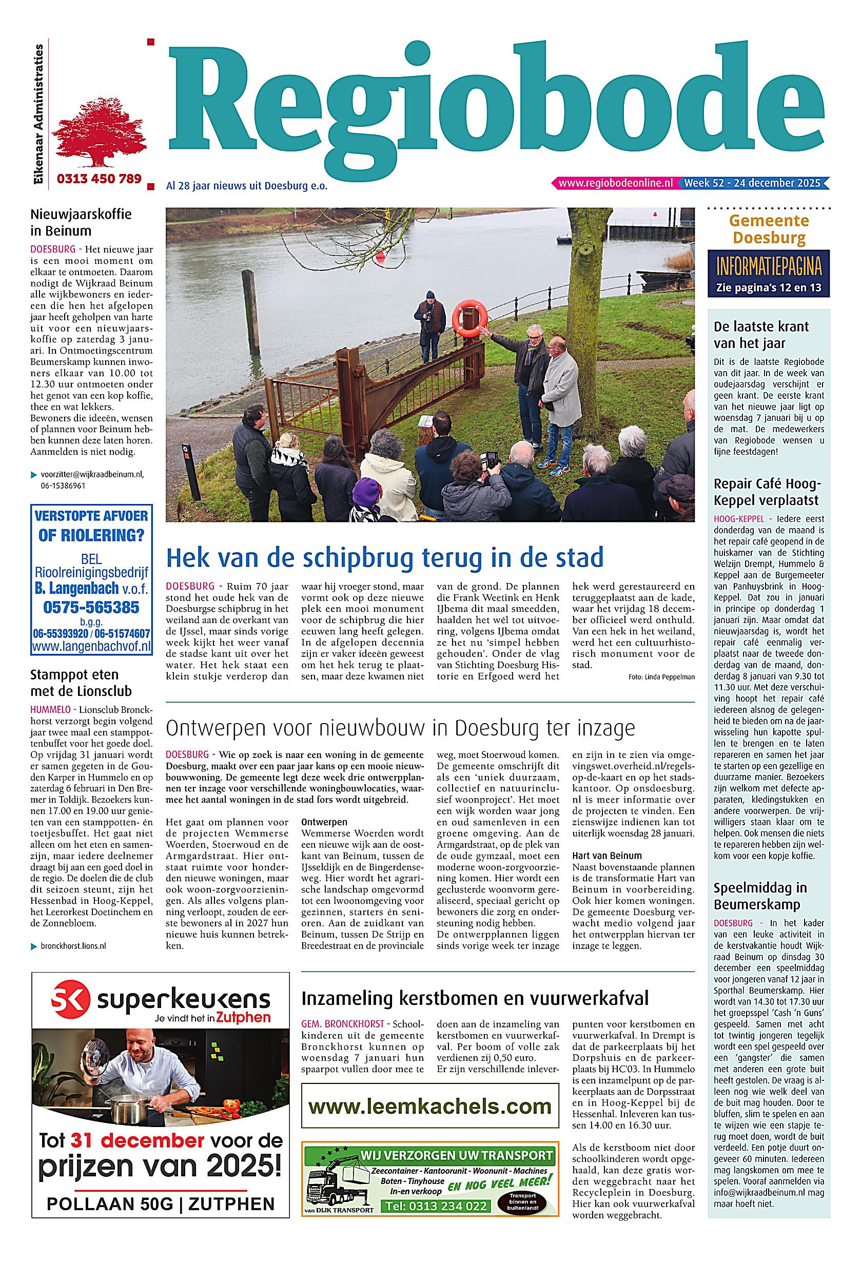 Welkom op het krantenarchief van Regiobode Beheer. Op deze plek zijn onze laatste uitgaven digitaal te lezen. Niet alleen zijn de redactionele bijdragen hier te zien, maar omdat complete uitgaven gedigitaliseerd worden, zijn ook alle advertenties te zien zoals ze in de gedrukte media zijn verschenen.